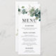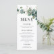An elegant sage green eucalyptus wedding menu featuring boho watercolor greenery and corner botanical designs with calligraphy script.
