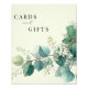 An elegant sage green eucalyptus wedding cards and gifts tabletop sign featuring boho watercolor greenery and corner botanical designs.