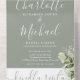All in one wedding invitation with pretty greenery floral, signature style names and chic typography on a sag green background. The invitation includes a perforated RSVP card that can be individually addressed or left blank for you to handwrite your guest's address details. Designed by Thisisnotme©