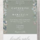 All in one wedding invitation featuring a beautiful floral greenery cascade, pretty string lights, elegant typography, and monogram initials on a sage green background. The invitation includes a perforated RSVP card with your wedding website QR code and details. Designed by Thisisnotme©