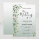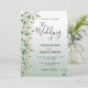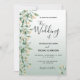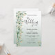 On front: Botanical theme. Sage green gradient, ombre background. Decorated with greenery, sprigs and foliage with small golden flowers. Modern large hand lettered script, typography with the text: The wedding of. Templates for Your names and wedding details. Black text.