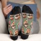 Funny custom face crew socks personalised with a photo and a sage green background. Upload a cutout of the face with a transparent background and it will automatically be replicated all over the socks, on both sides. To make the cut-out, you can download any mobile or computer app, or use the program named Canva or Photoshop.