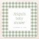 A classic sage green gingham check pattern frames a white rectangle with rounded corners and a thin sage green border, with the name of the mother-to-be and the words "baby shower" in charming sage green typography. Add the date below in grey sans serif font. This gender-neutral design is deal for a girl's or boy's baby shower.