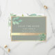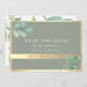 Modern save the date card with elegant eucalyptus watercolor greenery, neutral sage green background, faux gold foil accents, and romantic script. Perfect for botanical, rustic, or boho weddings.
