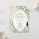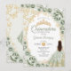 Sage green gold Quinceanera celebration invitation. Features brunette girl in ball gown dress, script font, gold butterflies, watercolor roses and tiara. Perfect for an elegant princess style glam celebration. Personalise with your own details. Printed Zazzle invitations or instant download digital printable template.