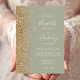 The left-hand edge of this elegant modern wedding invitation features a gold faux glitter border. The customisable text combines ivory handwriting, copperplate and italic fonts on a sage green background. The reverse side features a matching sage green and gold design.