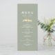 Elegant sage green wedding menu with a romantic faux gold lovebirds illustration and white minimalist typography. Perfect for spring, summer or fall receptions, this menu card complements a timeless and nature-inspired wedding theme. Fully editable with your starters, main course, and dessert. Matches the full gold lovebirds wedding suite.