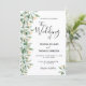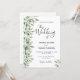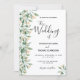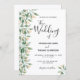 On front: Botanical theme. A chic white background. Decorated with greenery, sprigs and foliage with small golden flowers. Modern large hand lettered script, typography with the text: The wedding of. Templates for Your names and wedding details. Black text.