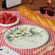 An elegant sage green lily of the valley wedding paper plate featuring Monet-inspired corner watercolor calla lilies and garden plant designs.