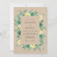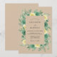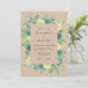 This design features a warm tan background layered with a rich watercolor floral arrangement. Delicate pale yellow roses and deep green blossoms are nestled amongst a variety of sage greenery and eucalyptus leaves. The earthy colour palette evokes a serene, natural atmosphere perfect for a seasonal outdoor ceremony. Hand-painted botanical details create a sophisticated yet organic feel.