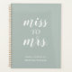 Custom-designed wedding planner notebook featuring "Miss to Mrs." modern hand script design on sage green background.