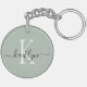 This modern sage green keychain with your first name in a trendy script font in black and your first initial in a modern cap font in white is perfect for your keys.