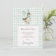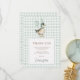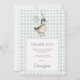 This retro-inspired thank you card features an adorable duck dressed in a party hat and bow tie, holding a whimsical balloon. The soft sage-green gingham background adds a cosy, rustic look.