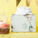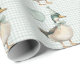 This retro-inspired wrapping paper features an adorable duck dressed in a party hat and bow tie, holding a whimsical balloon. The soft sage-green gingham background adds a cosy, rustic look.
