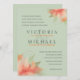 Abstract autumn orange flowers on sage green background with wispy leaves and whimsical swirls border this beautiful wedding invitation set. Perfect for romantic garden weddings or formal country estate weddings in any season -- simply change the backbround colour for spring, summer, autumn, fall, and winter. Classic formal text is sure to please the traditional vintage bride, but a splash of sophisticated styling makes it trendy enough for modern brides. Simple but stylish elegance at bargain discounts and affordable prices for frugal brides on a budget. Shown on Basic card stock-- or select paper choices to see premium quality Felt, Linen, Recycled or Metallic paper options. Customise it to change the font colours and styles. Please contact us if you would like this design modified to match your bridal party colour theme. This easy to use template can also be personalised for any special occasion such as engagement and marriage announcements, anniversary party invitations, womens feminine birthday party invitations, corporate and business events, charity fundraisers. Please contact us for assistance if you need help to create your own unique one-of-a-kind invitations. CARD SIZE: 5.5 x 7.5 inches -- other sizes, colours, and paper styles available.