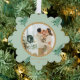 Celebrate the holiday season with elegance using our Sage Green Pagoda Merry Christmas Tree 2-Photo Ornament. This ornament features the words "Merry Christmas" on our signature Sage Green Christmas tree pattern, with space for a customisable photo on the front. The back includes another customisable photo and the phrase "Wishing you a very merry Christmas." Personalise both sides by replacing the photos, name, and date to create a meaningful keepsake. Be sure to explore our matching ornaments and items in the Chinoiserie Pagoda Christmas Collection for a complete festive look.