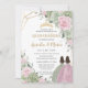 This chic Quinceañera invitation features a gold glitter geometric frame adorned by delicate watercolor sage green, pale pink floral, soft sage greenery and a girl in a lovely sage green dress and another girl in a pretty pink dress. Personalise it with your details easily and quickly, simply press the customise it button to further re-arrange and format the style and placement of the text. Also great for Sweet 16! (c) The Happy Cat Studio