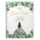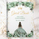 This elegant and glamourous Quinceañera guest book features a beautiful princess with dark hair in a sage green ball gown. The text combines handwritten script and modern sans serif fonts for a classy and sophisticated look. The floral arrangements and gold confetti create the perfect blend of rustic and chic.