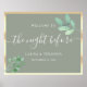 Elegant rehearsal dinner welcome sign in soft sage green with watercolor eucalyptus leaves and faux gold border. A refined and modern botanical design perfect for welcoming guests the night before your wedding. Personalise with your names and date.