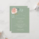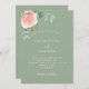 A sage green background. Decorated with a rose gold and blush pink floral, rose flower and green watercolored eucalyptus leaves, sprigs, greenery and faux gold sprigs. Personalise and add your names and wedding details.