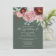 An elegant watercolor design with large peony and roses in shades of dusty rose with beautiful eucalyptus greenery on a sage green background. The back of the card has the sage green background with a small floral arrangement at the centre. This beautiful invitation is part of a matching wedding suite that can be fully personalised.