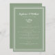 Simple, minimalist and elegant Wedding Menu features a contemporary design with a double frame crisp white border in on a rustic sage green background. Traditional wording provides timeless yet modern sophistication. Personalise wedding design with your menu details in white lettering and script. The back of the card matches in solid matching sage green.