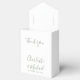 Elegant wedding favour box featuring stylish signature script names and special date set in modern typography on a sage green background. You can personalise with your own thank you message under the lid. A perfect way to say thank you to your guests! Designed by Thisisnotme©