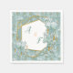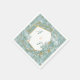 Pale soft pastel shades of sage green/light blue silk drape with pale white lace flamingos and flowers personalise with the wedding couple initials.