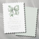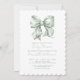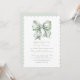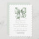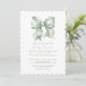 A Gender-Neutral Sage Green Bow Baby Shower Invitation. This elegant design features a soft sage green watercolor bow on the front, complemented by a matching sage green background on the back. The text is styled in a mix of classic serif fonts and delicate calligraphy script, creating a refined yet approachable aesthetic.
