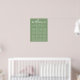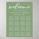 This simple solid sage green wedding seating chart poster features elegant white script for an outdoor ceremony in a nature setting. Minimalist typography on peaceful light green decor for a rustic venue outside near a forest of trees with up to 16 tables.