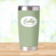 Gift your wedding bridesmaid with this trendy and personalised, stainless steel, thermal tumbler with her name in stylised script in a white oval design. Background colour and script is a sage green colour. Personalise your thermal tumbler by editing and replacing bridesmaid name with desired name. Available in many, popular bridesmaid wedding colour schemes.