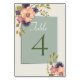 Simple, elegant, botanical, modern, sage green wedding table number with watercolor pink flowers and greenery.