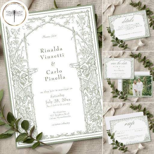 Sage Green Vintage Botanical Trellis Arch Wedding Invitation