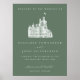 This wedding welcome poster features a vintage illustration of a castle, which you can replace with an image of your destination wedding venue. Serif lettering lays out the bride and groom names, and details of the wedding, including the location and date, on a sage green background.
