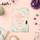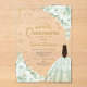Sage green gold Quinceanera celebration invitation. Features brunette girl in ball gown dress, script font, gold butterflies, green roses and tiara. Perfect for an elegant princess style glam celebration. Personalize with your own details. Stylish transparent or frosted acrylic invitations.