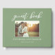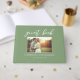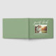 This simple solid sage green wedding guest book with couple engagement photo features elegant white script for an outdoor ceremony in a nature setting. Minimalist typography on a peaceful light green guestbook for a rustic venue outside near a forest of trees.