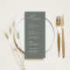 Elevate your wedding tablescape with our Sage Green Boho Modern Wedding Menu. Featuring elegant calligraphy fonts on a soothing sage green background, this dual-purpose menu serves not only as a guide to your culinary delights but also personalizes each guest's seating with their name beautifully scripted on the reverse side. No need for separate place cards, making for a seamless and sophisticated table setting. Perfect for couples seeking a blend of boho charm and modern elegance.
