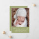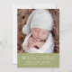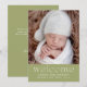 A simple modern birth announcement to share the news of your newborn baby. The sage green gender neutral card is perfect for your baby boy or girl . It features a photo on the front and welcome in a white typography. Personalise with baby's name, birth date, birth stats and a personal message from Mum and Dad