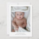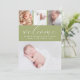 A modern birth announcement to announce the arrival of your newborn baby boy or baby girl . The simple design features a sage green card on the front with welcome in a white handwritten script font with a photo collage. The reverse side is white with one large photo. Personalise with baby's name, birth date, birth stats and parent's names.