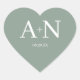 Modern white monograms on a sage green background are placed on a heart-shaped sticker.