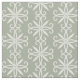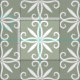Fabric in a pale olive or sage green with a pattern of elegant swirly motifs on it.