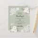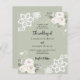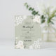 For an elegant and romantic wedding. A sage green coloured background decorated with white florals, roses and white lace. Personalise and add your names and details.