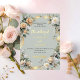 A sage green background. Decorated with white and yellow florals and a golden ribbon. Personalise and add your names and details.