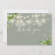 An elegant eucalyptus greenery botanical string lights thank you card, personalised with a special message on the reverse on a sage green background. Designed by Thisisnotme©