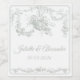 Elevate your wedding tablescape with this refined Toile de Jouy wedding bottle label in an elegant sage grey palette. Inspired by classic French 18th-century engravings, this design showcases an ornate floral frame with a delicate hanging flower basket illustration, bringing timeless romance and understated sophistication to your celebration.
