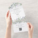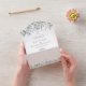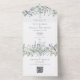All in one wedding invitation featuring pretty watercolor greenery foliage and elegant modern typography. The invitation includes a perforated RSVP card with your wedding website QR code. Designed by Thisisnotme©