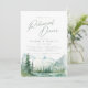 Watercolor lush green pine forest, teal river, and misty mountain with sage modern script, elegant and romantic, great rehearsal dinner invitation for boho rustic wedding and mountain forest destination wedding in spring and summer.