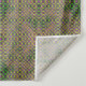 A complex geometric pattern features vibrant colours, including greens, purples, and blues, intricately woven into a repetitive symmetrical design. Small squares and circles form a kaleidoscopic effect, creating an eye-catching mosaic.