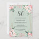 Customisable 80th birthday invitation, featuring pretty pink blush floral bouquets and leafy greenery on a sage green background, with a gold geometric frame.