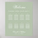 A simple seating chart with 8 tables, for a wedding with sage wedding colour. The background is sage green, the text is white. The word Welcome in the upper part and the names of the bride and groom are written in an elegant calligraphic script, the rest in caps.